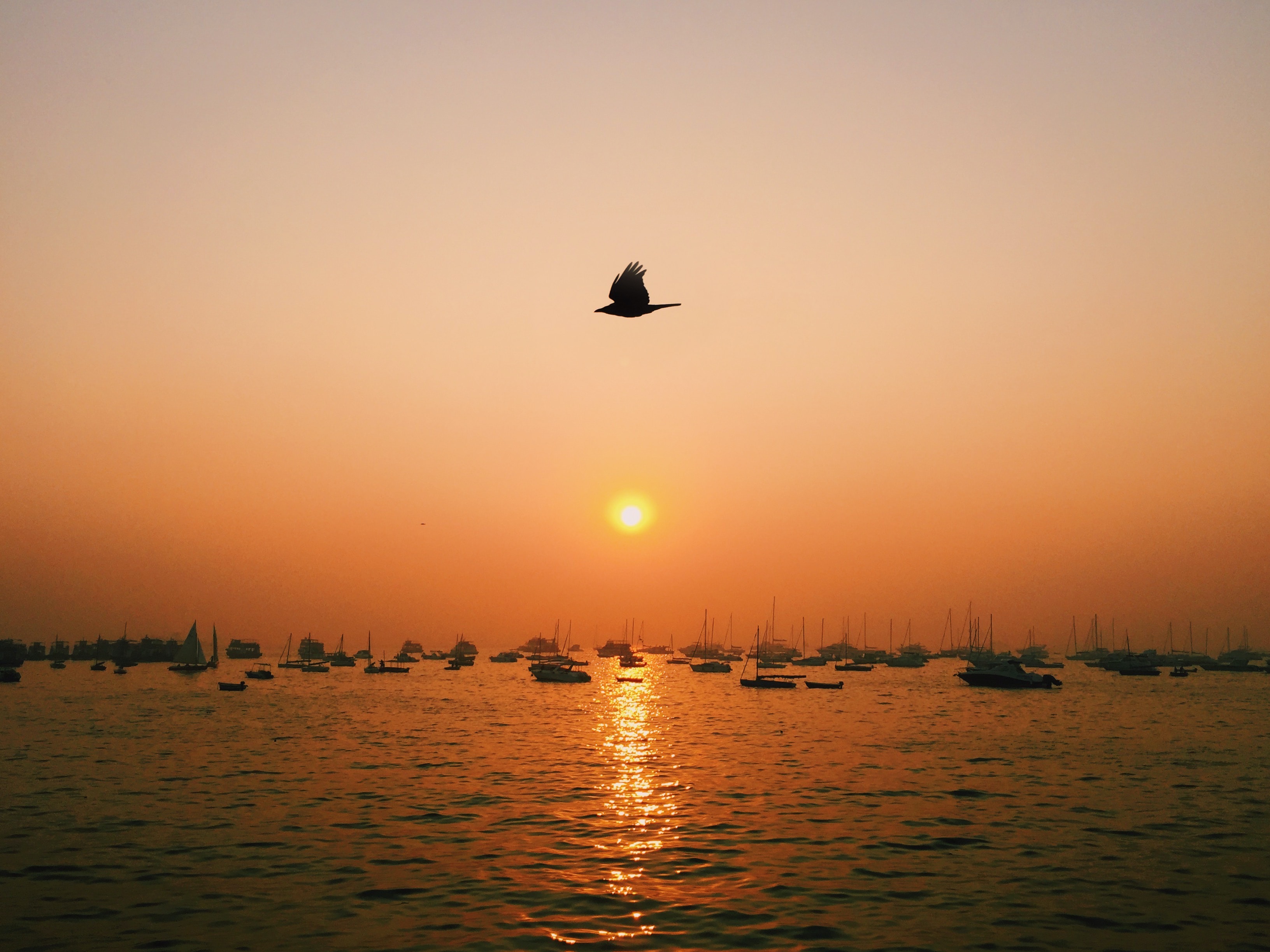 bird flying in front of sunset